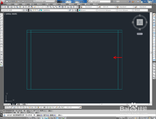 点击右边东西栏中的【偏移东西】,在号令栏输入偏移数值:25后,对顶边进行标的目的下偏移。在号令栏输入偏移数值:50后,对侧边进行标的目的内偏移。点击【修剪】对图示线段进行修剪(如图所示);