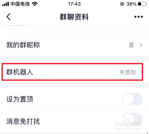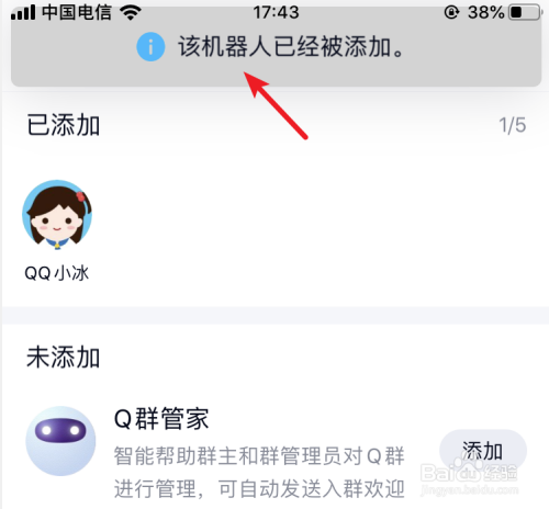 点击添加后,页面上方会提醒机械人已经被添加,这时,群聊机械人已经添加当作功。