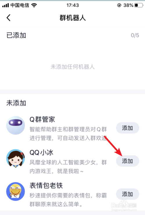 点击后可以看到下方的群聊机械人,选择需要添加的群聊机械人,点击后方的添加。