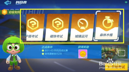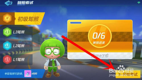 我们点击进入驾照测验后,在左侧有个初级驾照测验,我们点击初级或者更高的驾照测验,点击下方的起头测验。