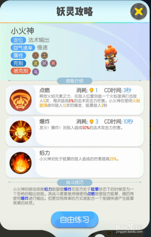 然后我们的小火神是属于火属性还有土属性的妖灵,并且都是双属性的妖灵。