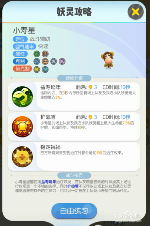 我们的小寿星是属于双属性的妖灵,然后是很好的战斗辅助妖灵。