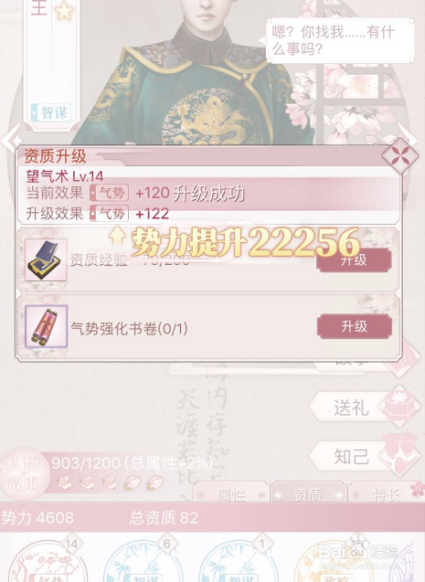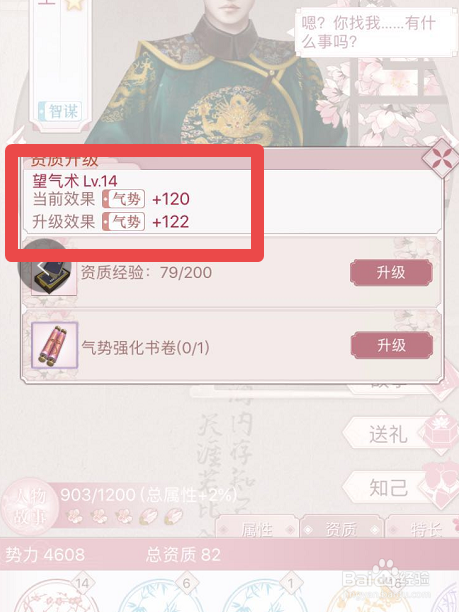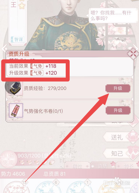 点击带着小红花的天资,然后就会呈现一个弹框,弹框内显示了该天资当前的结果,以及进级之后的结果,然后点击进级按钮。
