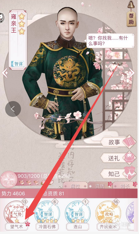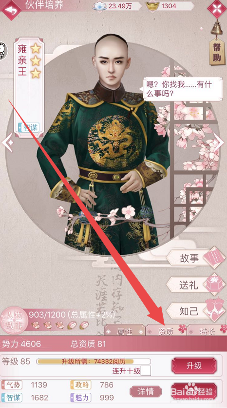 选好伙伴点击就可以进入到伙伴信息的详情页面了,可以在页面的下半部门的属性后面看见“天资”选项,点击就可以进入到天资页面了。