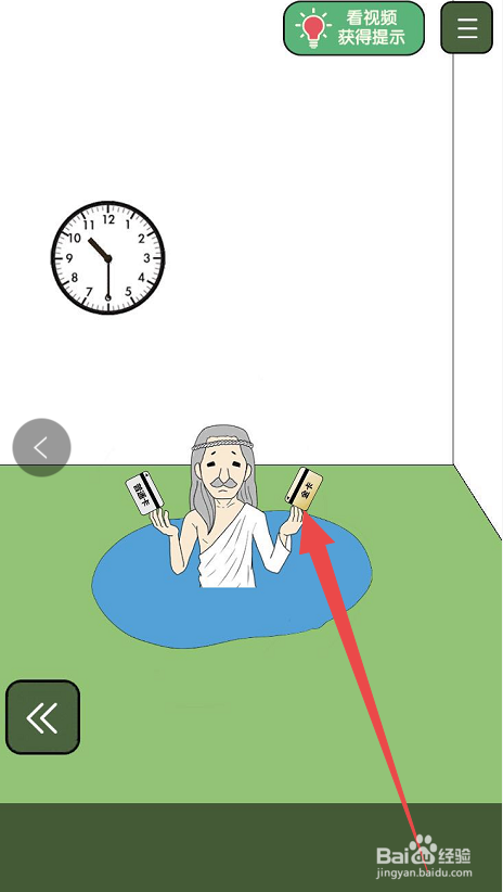 拿到通俗的银行卡之后,点击页面右侧的箭头达到右侧的房间,在右侧的房间内可以看见识上有一片水,点击道具栏内的银行卡,将其扔进水内,然后会从水中呈现一个仙人,手里拿着两张银行卡,点击此中的金卡,收成金卡。
