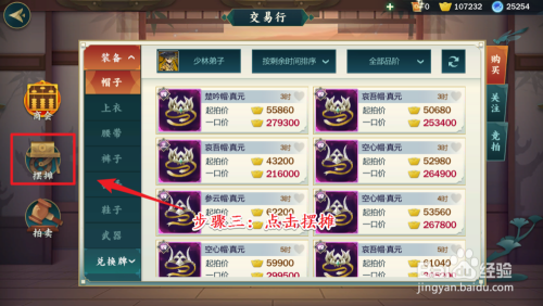 剑网3手游买卖步调三:打开买卖行操作界面今后。继续点击界面左侧的“摆摊”功能。