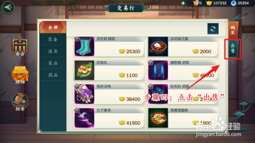 剑网3手游买卖步调四:打开摆摊功能界面今后。点击界面右侧导航栏中的“出售”功能。
