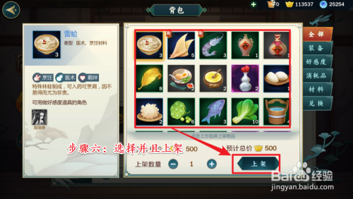 剑网3手游买卖步调六:打开摊位操作界面今后。在背包物品中选择可以出售的道具。最后设置价钱后点击上架即可。