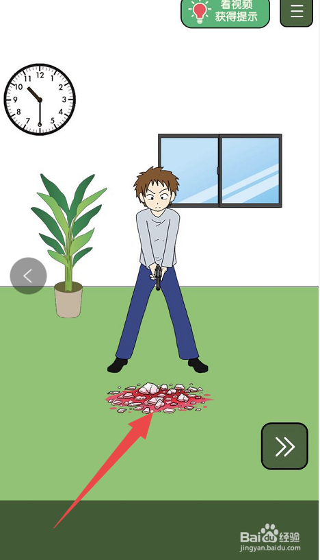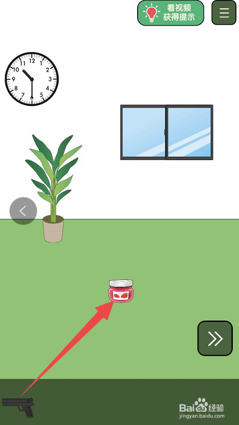 拿到手枪之后回到最起头的页面,在这个页面内将手枪移到果酱瓶子的上方,之后游戏人物就会呈现并手握手枪将果酱瓶子打坏。