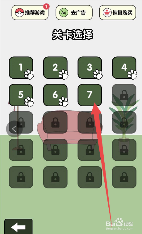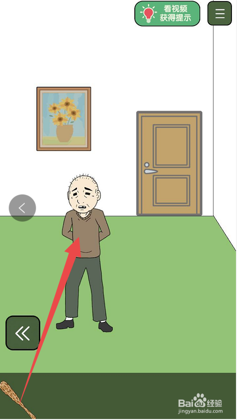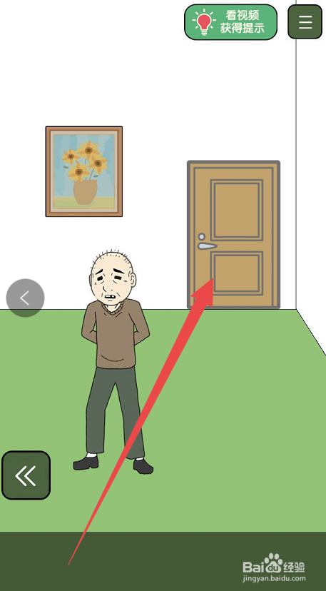 进入到第七关的具体挑战页面之后,点击页面右侧的箭头,到右侧的房间,在右侧的房间内有一个老爷爷,而且布景中还有一扇门,点击这扇门到门外。