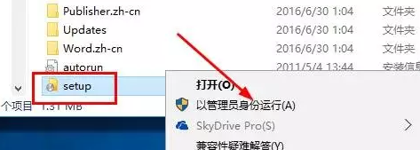 选择解压后的文件,右击打开解压之后的文件夹,点击Office2010文件夹,鼠标右击setup号令,选择以办理员的身份运行