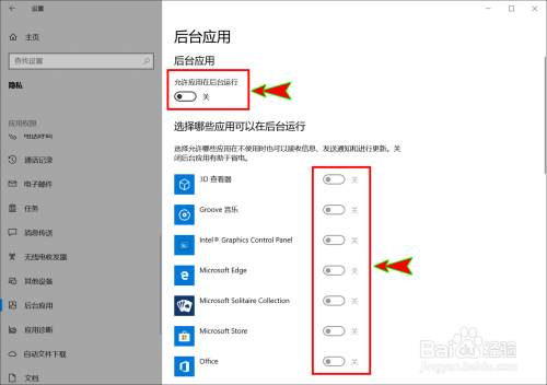 打开“后台应用”选项后,在设置里我们可以选择直接封闭“许可应用在后台运行”功能,也可以有选择性的封闭不想在后台运行的应用。