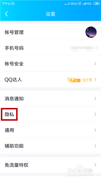 然后在手机QQ的设置界面中找到【隐私】功能并点击。