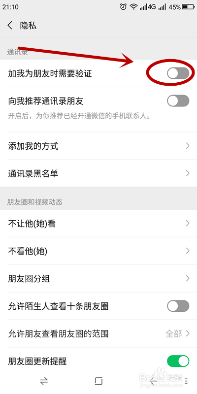 在“隐私”页面,找到“加我为伴侣时需要验证”,若是该按钮此刻是灰色的,你被目生人添加为老友就不稀奇了。单击该按钮,阿牛酿成蓝色,暗示今后再有人要添加你为老友时,需要你的赞成了。