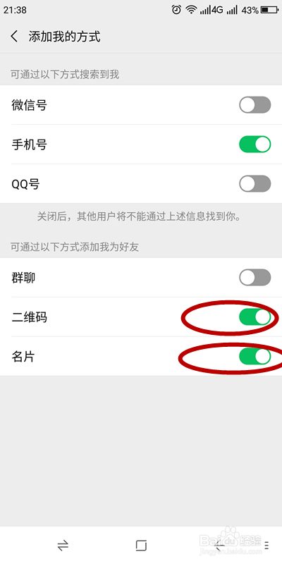 在“添加我的体例”页面,按照本身的现实环境,选择别人可以添加的体例,好比“二维码”“手刺”等,按钮酿成蓝色暗示已经开通该功能。这样今后别人只能经由过程这两种体例添加你,你赞成之后才能添加当作功