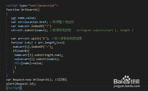 2、经由过程JS代码编写函数,获取地址栏的毗连,然后再毗连中截取字符串获取参数。实现函数如下图所示。然后经由过程挪用alert(Request.id);读取参数信息
