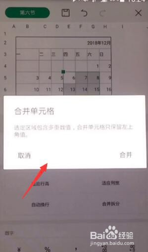 如下图表格,“2018年12月”这个题目是在日历表格中居中显示的,我们需要将这一行中的7个单位格归并到一路。