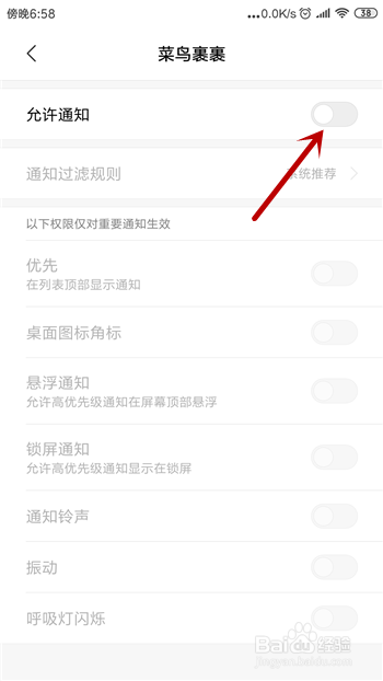 如图所示,这样我们就封闭了菜鸟裹裹的新动静通知,今后不会接管到新动静。