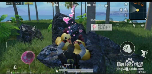 进入到岛上,我们在中心能看到一对小黄鸡(虐狗啊),接近会呈现“打卡”,点击后游戏人物会跳舞,并获得粉色爱心气球,走路都带爱心;
