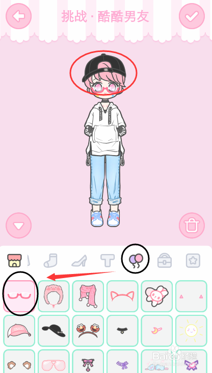 别的还可以搭配帽子,彩色眼镜,如图所示,再点击右上角的箭头,就可以挑战当作功了。