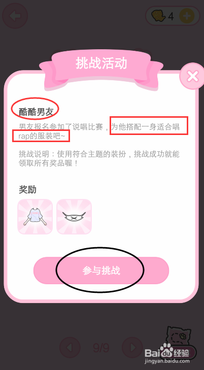 注重游戏的提醒:搭配男孩的说唱rap服装,再点击【介入挑战】