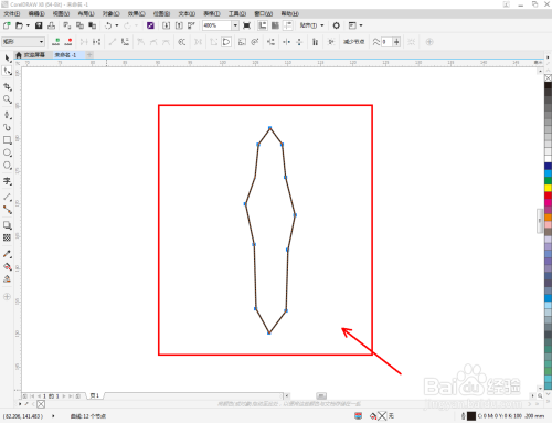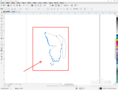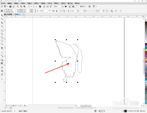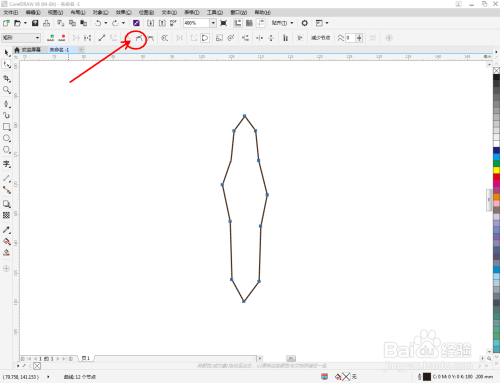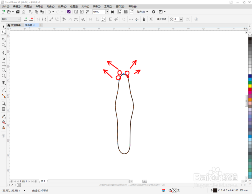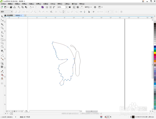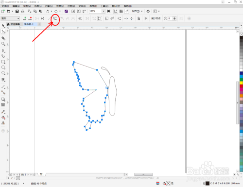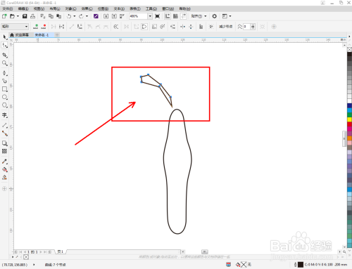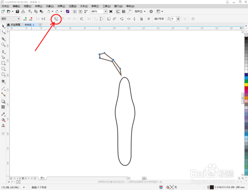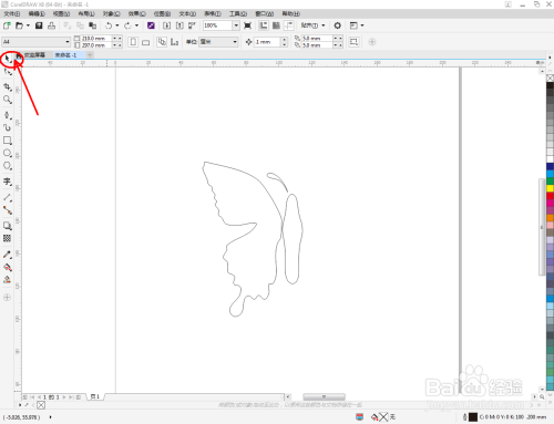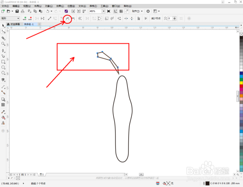 点击【钢笔东西】在图示区域绘制第二个多边图案后,点击【外形东西】,框选图案上的节点,点击【转化为曲线】将节点转曲。完当作后,选中图示图案上的节点,点击【光滑节点】将节点进行光滑处置并调整好节制点,完当作蝴蝶触角图案部门图案的建造(如图所示);
