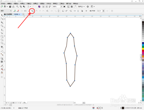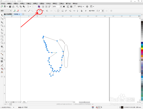 点击【钢笔东西】在图示区域绘制一个多边图案后,点击【外形东西】,框选图案上的节点,点击【转化为曲线】将节点转曲。完当作后,选中图示图案上的节点,点击【光滑节点】将节点进行光滑处置并调整好节制点,完当作蝴蝶本家儿体部门图案的建造(如图所示);