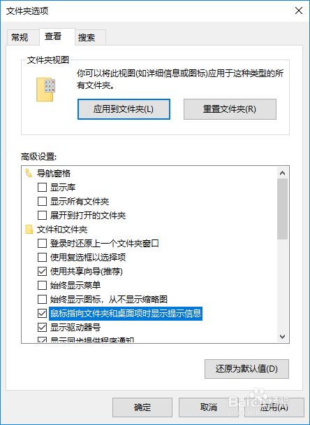 勾选对话框中的“鼠标指标的目的文件夹和桌面项时显示提醒信息”;