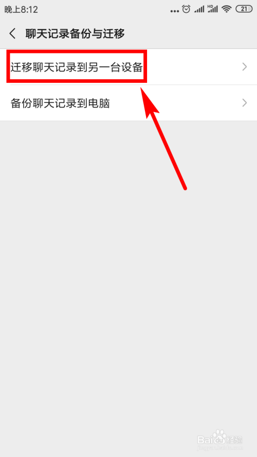 紧接着,在新跳出的页面上点击第一个选项——【迁徙聊天记实到另一台设备】。