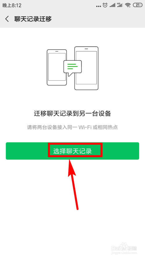 在新的页面中,我们可以看到有一个绿色的【选择聊天记实】按钮,点击该按钮。