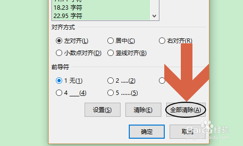 接着会弹出段落对话框,点击对话框左下角的“制表位”,然后选择制表位对话框右下角的“全数断根”,这样之前添加过的所有制表符就一会儿全数断根了;