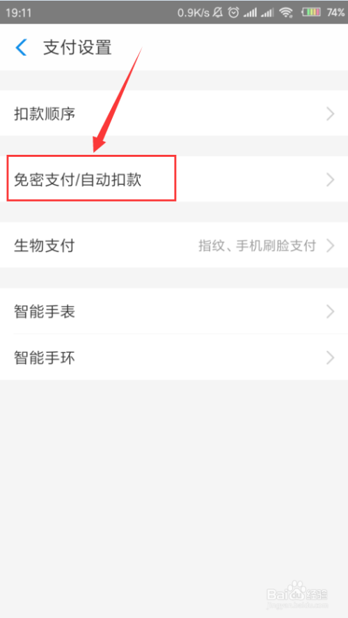 选中“设置”界面中的“支付设置-免密支付/主动扣条目”选项。
