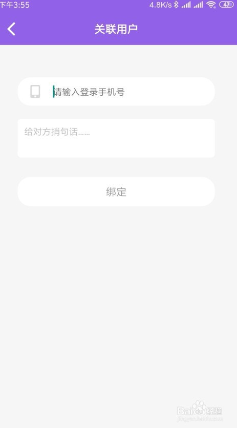 接下来在打开的联系关系用户菜单中我们输入登录手机号,点击绑定按钮就可以了