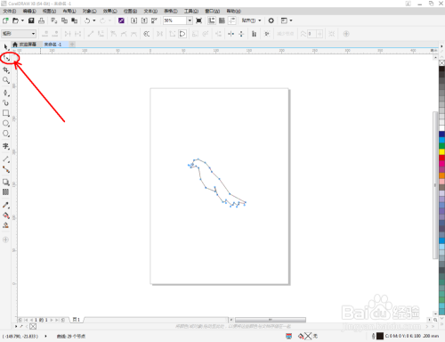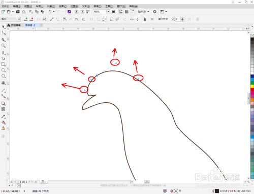 点击【钢笔东西】按图示绘制一个多边图案后,点击【外形东西】,框选图案上的节点,点击【转化为曲线】将节点转曲。完当作后,选中图示图案上的节点,点击【光滑节点】将节点进行光滑处置并调整好节制点,完当作本家儿体部门图案的建造(如图所示);