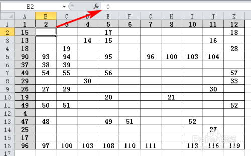 在L2单位格中输入公式“=IF(B2=0,"",B2)”,按回车键确认,然后将公式填充到V16单位格。此时我们可以发现,对应左侧的表格,本来是0的单位格中的0不见了,而原本不是0的单位格仍是本来的内容。