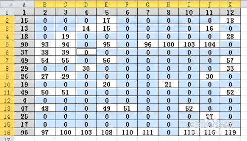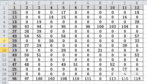 如下图所示的表格中有很多0值,此刻要把这些0值埋没失落。