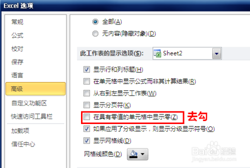 先切换到【高级】选项卡,然后往下滑一点,找到“此工作表的显示选项”分类,将“在具有零值的单位格中显示零”前面的勾去失落。最后单击【确定】按钮。