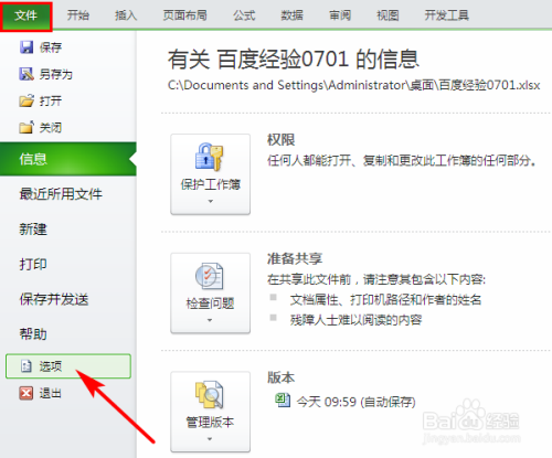 单击【文件】按钮,选择【选项】,打开“Excel 选项”对话框。
