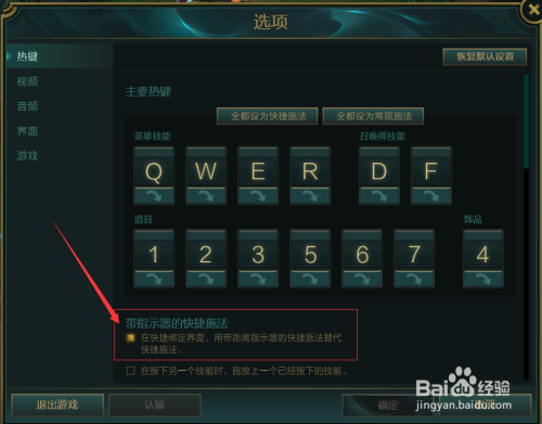 去失落“带指示器的快捷施法”上的勾之后点击“确定”即可。