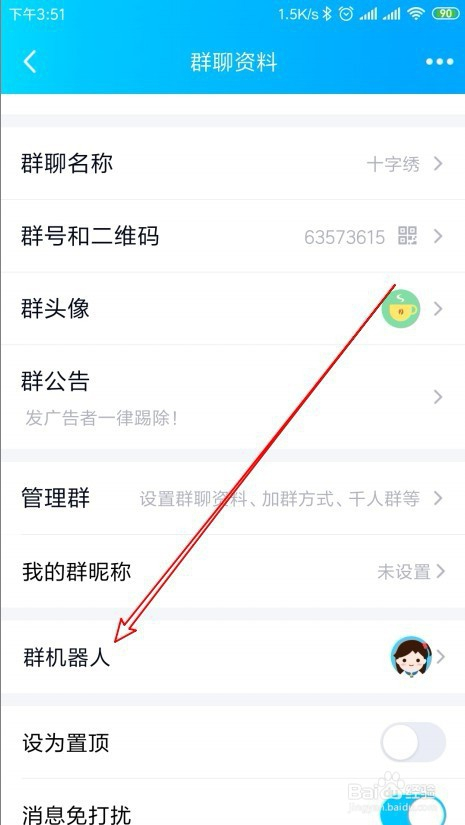 然后在打开的群聊资料,页面中点击群机械人的菜单项