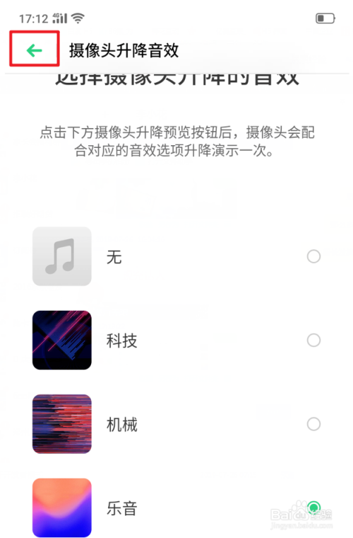 点击音效进行试听,选择本身喜好的音效。同时,也可以点击底部的摄像头起落预览的选项来查看结果。