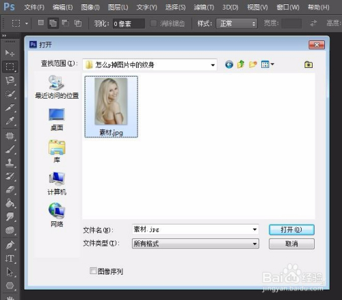 第一步:打开ps软件,按快捷键ctrl+O,选择需要p失落纹身的图片,单击“打开”。