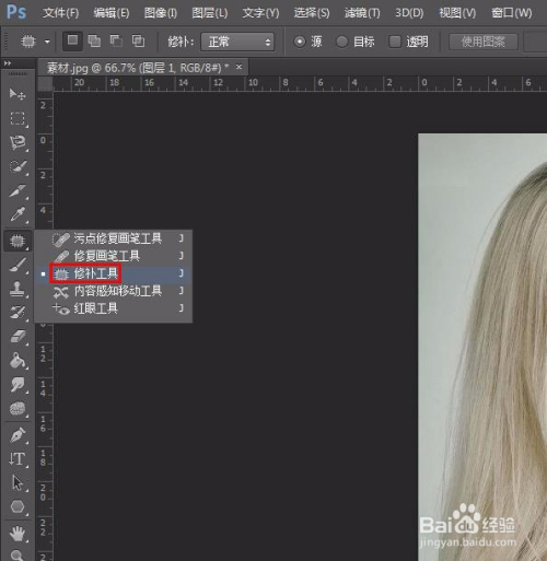 第三步:在ps操作窗口,左侧东西栏中选择“修补东西”。