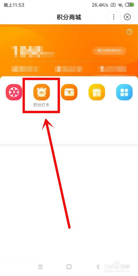 进入到积分商城这个页面中之后,在该页面的左上方位置我们找到积分打卡这个图标选项,点击进入。