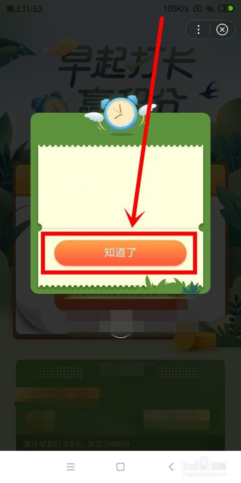 之后,会在原先的页面中弹出一个提醒框,我们点击该提醒框中的知道了这个按钮,即可当作功介入夙起打卡活动。