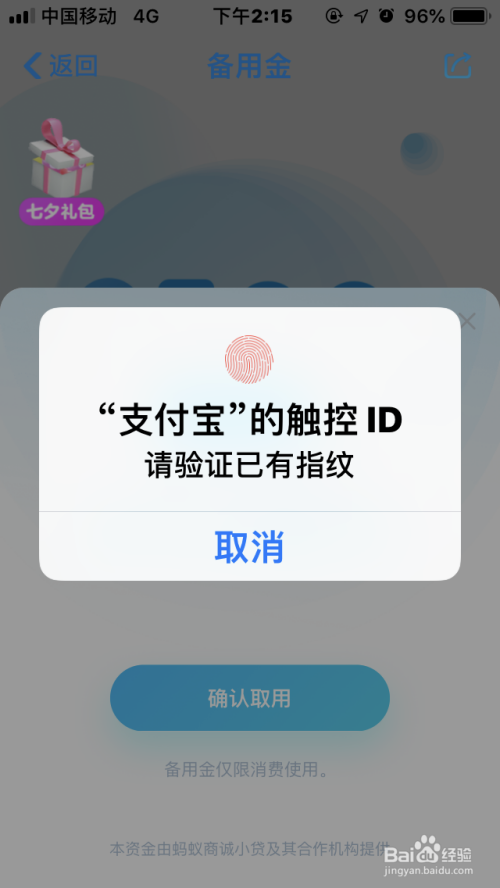 点击”赞成和谈并取用“,验证指纹密码验证身份,即可取用备用金到”支付宝余额“,余额可以提现,可以消费。