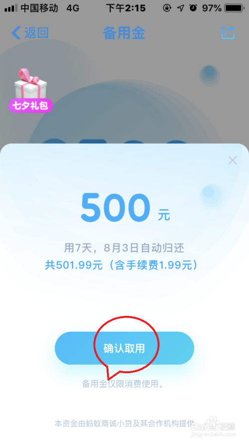 支付宝备用金是支付宝推出的小额急救金额,仅仅收取1.99手续费,期限7天,备用金固定额度每报酬 500 元,很适合”急用“。下面介绍一下”支付宝备用金是什么?如何取用?“