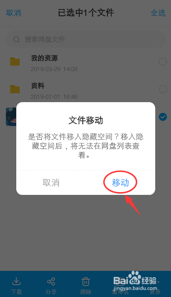 就会呈现以下文件移动对话框,点击【移动】,就可以把网盘的文件插手埋没空间。