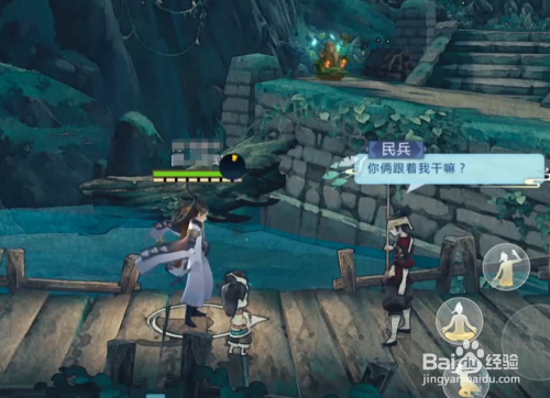 下一个处所,我们可以选择跟踪纯阳门生,随后我们大要到右边一点点的一个桥,我们可以开启心眼,就可以看到有一个平易近兵,他说完话之后就可以竣事。