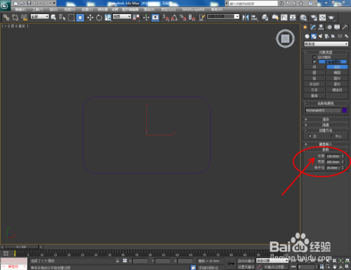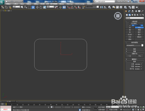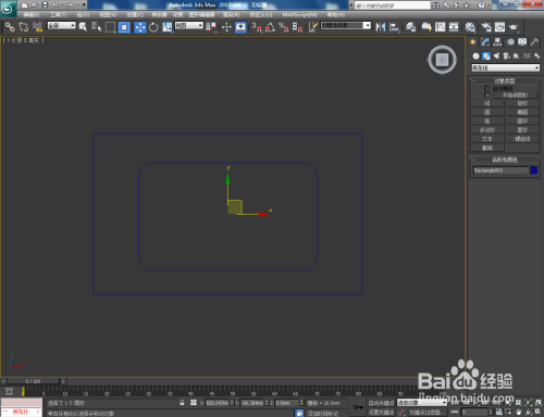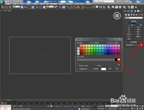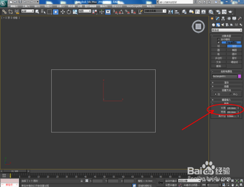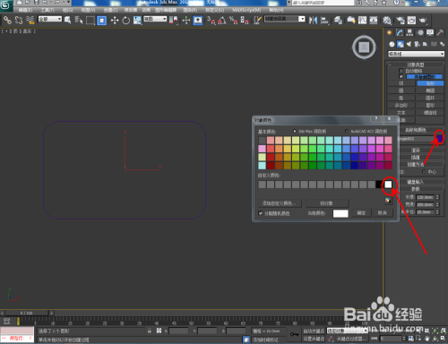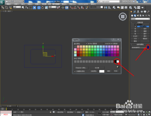 打开3Dmax2012软件,点击【建立】-【图形】-【矩形】,按图示将矩形的长设置为:120,宽设置为:200,绘制出一个直角矩形图案。选中矩形图案,点击【对象颜色】将图案的对象颜色设置为:白色;